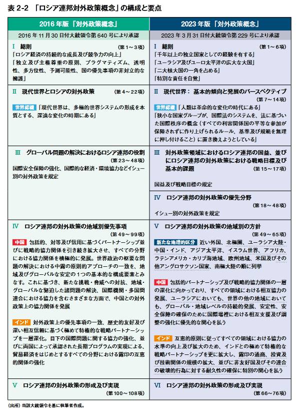 第2章 2022年2月24日、プーチン体制は、ウクライナへの全面的な軍事侵攻に踏み切り、米欧諸 国による厳しい経済制裁と広く国際的な信用の失墜を招いた。既存の国際秩序に対する挑戦者 となったプーチン体制の秩序観には、G7諸国が志向する国際秩序への強い対抗意識があり、 この点は2023年3月に改訂された「ロシア連邦対外政策概念」の中で強調されている。