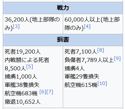 損害 死者19,200人 内戦闘による死者8,500人[5] 捕虜1,000人 軍艦38隻損失 航空機683機 [6][7] 撤退10,652人 死者7,100人[8] 負傷者7,789人以上[9] 捕虜4人 軍艦29隻損失 航空機615機[10]