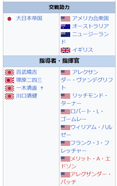 指導者・指揮官 大日本帝国 百武晴吉 日本 塚原二四三 大日本帝国 一木清直 † 大日本帝国 川口清健