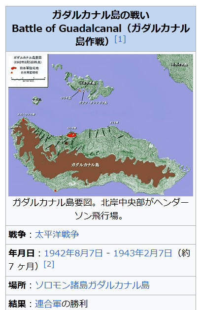 ガダルカナル島の戦いhttps://ja.wikipedia.org/wiki/%E3%82%AC%E3%83%80%E3%83%AB%E3%82%AB%E3%83%8A%E3%83%AB%E5%B3%B6%E3%81%AE%E6%88%A6%E3%81%84