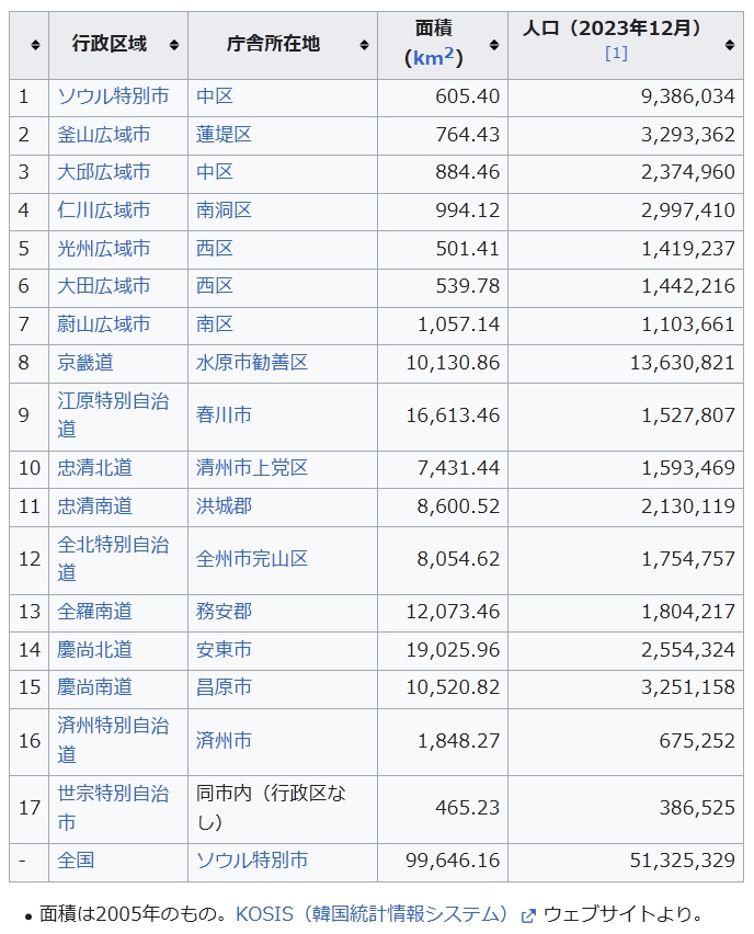 - 全国 ソウル特別市 99,646.16 51,325,329 面積は2005年のもの。KOSIS(韓国統計情報システム) ウェブサイトより。