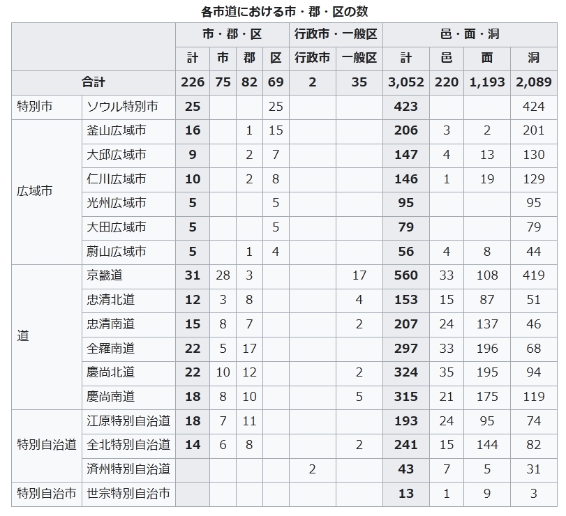 特別市・広域市の下には区・郡が、道の下には市・郡が置かれている。基本的にはこれらが韓国の基礎自治体である。