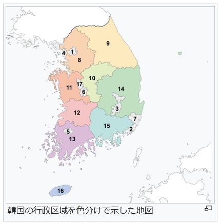韓国の行政区域を色分けで示した地図