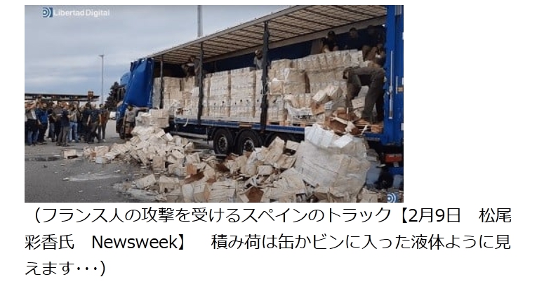 さらにこの出来事から3ヶ月たった1月下旬。前回同様にフランス人農家たちが道を封鎖し、スペインからくる運搬トラックの積み荷の農作物を再び攻撃し始めました。国境付近で身動きが取れなくなったトラックにフランス人農家らは積み荷は何か質問をし、もし農作物だと分かったら一斉に襲い始めるのだそうです。