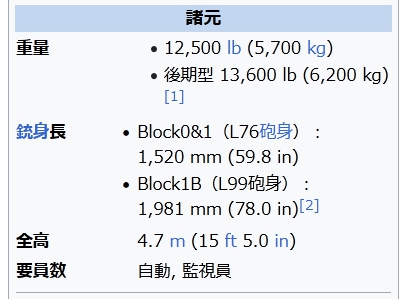 銃身長 Block0&1(L76砲身):1,520 mm (59.8 in) Block1B(L99砲身):1,981 mm (78.0 in)[2] 全高 4.7 m (15 ft 5.0 in) 要員数 自動, 監視員