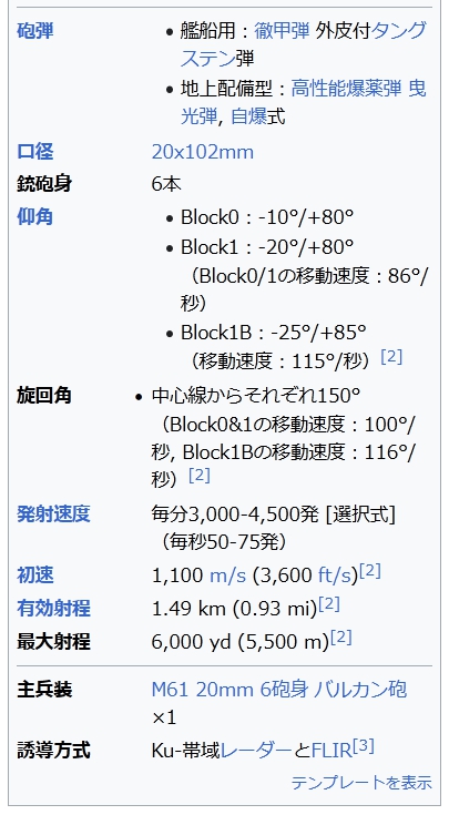 旋回角 中心線からそれぞれ150° (Block0&1の移動速度:100°/秒, Block1Bの移動速度:116°/秒)[2] 発射速度 毎分3,000-4,500発 [選択式](毎秒50-75発) 初速 1,100 m/s (3,600 ft/s)[2] 有効射程 1.49 km (0.93 mi)[2] 最大射程 6,000 yd (5,500 m)[2] 主兵装 M61 20mm 6砲身 バルカン砲×1 誘導方式 Ku-帯域レーダーとFLIR[3] テンプレートを表示