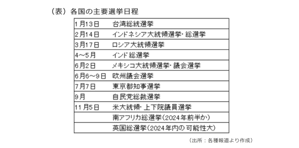 2024年は米大統領選挙が予定されているのは、皆さまよくご存じのことでしょう。しかし、米国以外にも重要な選挙が来年は多く実施される予定です。下表に主要な選挙日程をまとめました。前述したように衆議院議員の任期は2025年10月までですが、2024年に解散される可能性があり、来年の主要選挙日程に日本の総選挙が加わるかもしれません。