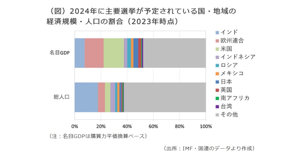 来年、選挙の実施される国・地域の世界に占める割合は、経済規模では約52%、総人口では約37%となっています。