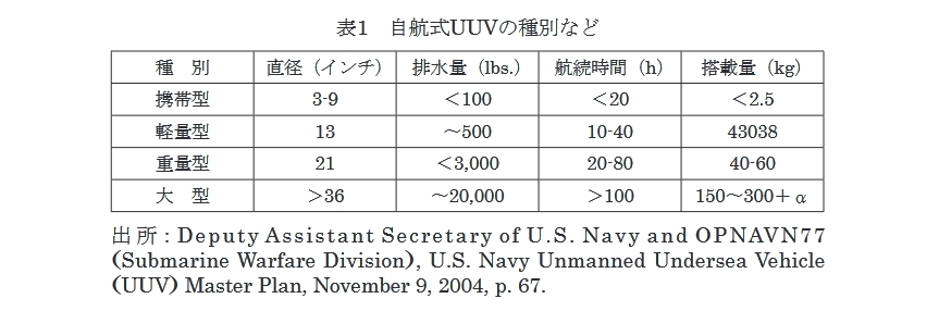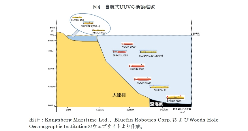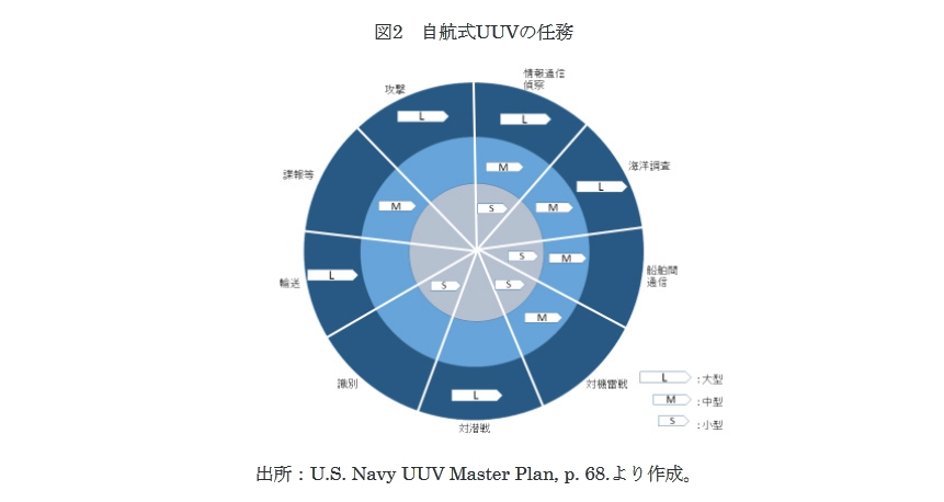 Warfare- A PLA Navy ‘ Assassain’s Mace’ Capability,?,China Maritime Study (No. 3, June 2009), pp.11-25. 例えば、SeaFox (米国、ドイツなど)、SeaWolf (フランス、ドイツなど)、K-Ster (フランス、インド、シンガポールなど)、OLISTER (フランス、マレーシアなど)。 Rovert W. Button, John Kamp, Thomas B. Curtin, James Dryden, A Survey of Mission for Unmanned Undersea Vehicles, RAND National Defense Research Institute, 2009, pp. 128-134. Office of the Under Secretary of Defense for Acquisition, Technology, and Logistics, u Study on Next-Generation Unmanned Undersea Systems,Report of The Defense Science Board, October 16, 2016, p. 5. Chief of Naval Operations Undersea Warfare Directorate, Autonomous Undersea Vehicle Requirement for 2025,” Report to Congress, February 18, 2016, pp. 8-9. Sean J. A. Edwards, uSwarming and the Future of Warfare/5 RAND Corporation, 2005, pp. 2-3. Carl Schuster, “ Drones Take South China Sea Plunge, Asia Times, August 29, 2012, . US Department of Navy, Office of Naval Research, Autonomous Military Robotics: Risk, Ethics, and Design,” December 20, 2008, pp. 4-5. 「半自律システム」は、人工知能で対処できない部分は遠隔操作により人が制御を行っ て機能する。UGVが障害物を避けつつ、オペレータの遠隔操作による誘導により、 目的地まで走行する例が挙げられる。一方「自動システム(automated system)」は、 結果が予想できる単純な応答や行動ができるにすぎない。Authory Finn and Steve Scheding, Developments and Challenges for Autonomous Unmanned Vehicles (Springer, 2010), pp. 41-44.; UK Ministry of Defence, a Joint Doctrine Note 2/11 —The UK Approach to Unmanned Aircraft Systems,w March 30, 2011,p. 2. £. “Leidos Commences Operational Testing Of DARPA ACTUV System, Navyrecognition.com, November 30, 2016. Andrew H. Henderson, “Murky Waters* The Legal Status of Unmanned Underwater Vehicles,w Naval Law Review 2006, pp. 1-2. ROVの運用上の問題点として、①海中の遮光や屈折による不十分な状況把握、② 船体と制御用画面に発生する死角、③ROVによる操作と状況認識のずれ、④水圧、 腐食、海流などに対する機体の劣化、そして⑤通信制限等が指摘されている。J. Matthew Gillis, “The Future of Autonomous Marine Systems in the Canadian Navy,” Canadian Naval Review, Vol.6, No. 4(2011), pp.15 21. MBES (multi-beam echo sounder•測深儀)を利用し、ウェイポイントとしての 入力した海域のデータベースと、UUVが航走中に読み取った海底地形のローカルマッ プの照合。 要目概要:長さ約7.4m、直径約0.7m、活動深度0.3,1.0,3.0,5.0km、活動範囲 450km以内。International Submarine Engineering Ltd.ウェブサイ ト参照。 “Water Drones U.S. Industry, University Take up Challenge of Robotic Subs,” —44一