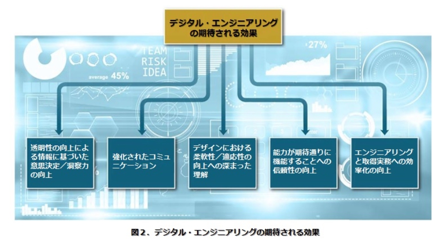 デジタル・エンジニアリングに期待される効果としては、情報に基づいた意思決定の向上、コミュニケーションの強化、システム・デザインの理解と信頼性の向上、エンジニアリング・プロセスの効率化などが挙げられる(図2)。