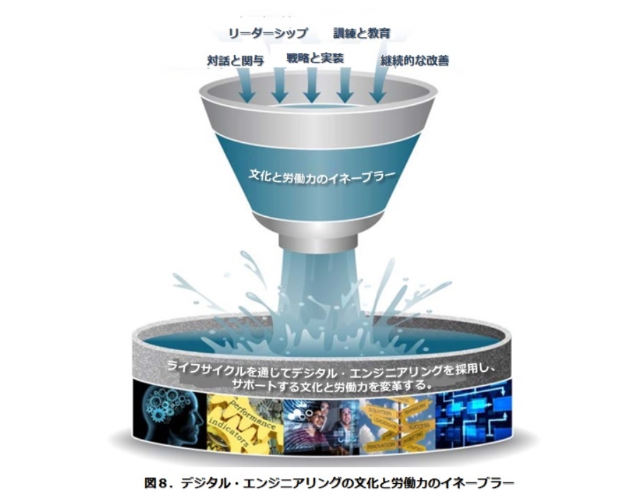 ライフサイクル全体でデジタル・エンジニアリングを採用し、支援するために、文化と労働力を変革する。最終到達目標は、変更管理(change management)と戦略的コミュニケーションのベスト・プラクティスを取り入れ、文化と労働力を変革することである。