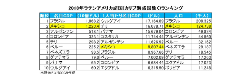 2018年ラテンアメリカ諸国(カリブ海諸国除く)ランキング 出所:IMFよりSCGR作成