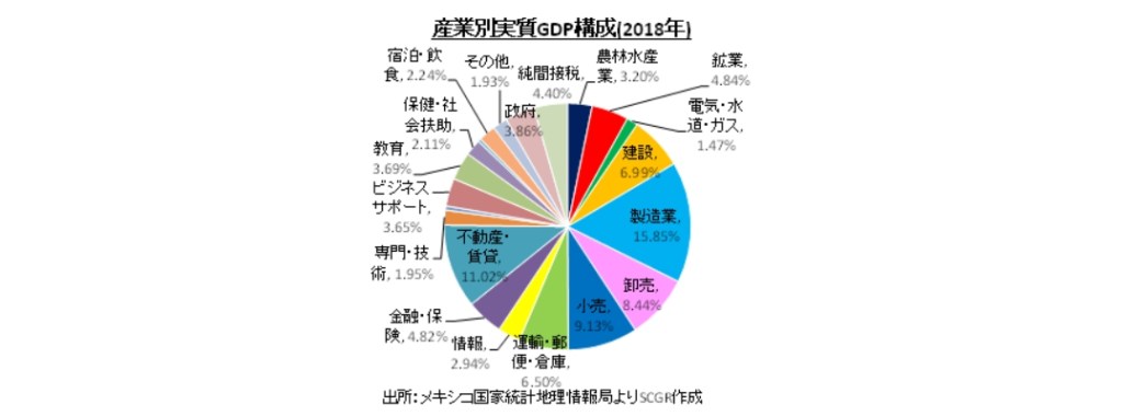 産業別実質GDP構成(2018年) 出所:メキシコ国家統計地理情報局よりSCGR作成