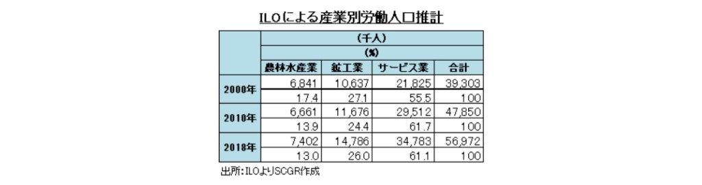 ILOによる産業別労働人口推計 出所:ILOよりSCGR作成