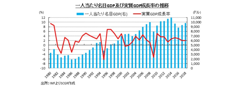 一人当たり名目GDP及び実質GDP成長率の推移 出所:IMFよりSCGR作成