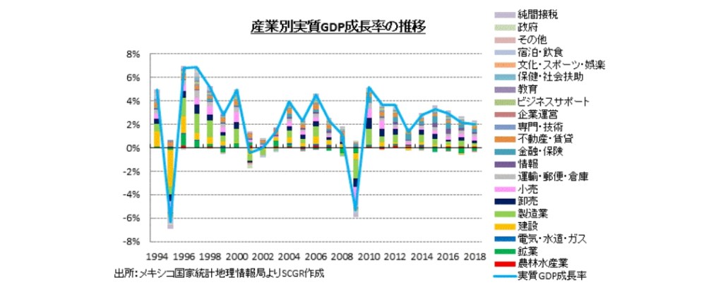 産業別では1995年の通貨危機(『テキーラ危機』)やその前後では建設業の寄与が大きかったが、その後は製造業にバトンタッチし、2009年リーマン危機以降は卸売、小売、金融・保険、不動産・賃貸などと並んで団子状態になっている。
