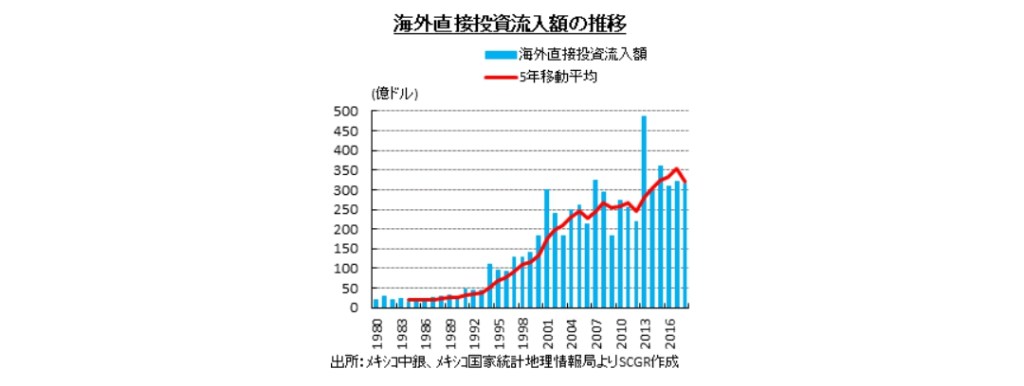 海外直接投資流入額は過去約60年間、総じて上昇傾向が続いている。5年平均の推移をみると1994年までは50億ドル未満だったが、1994年に50億ドルを超えてから1998年までに倍増し100億ドルに、1998年から2002年にはさらに倍増し200億ドルに急増した。2002年からは幾分減速し2004年に250億ドルを超えてからは2012年までほぼ横ばいであった。2013年ベルギーのABインベブによるメキシコ最大手ビールメーカーの買収が主因で500億ドル弱まで急騰したが、その後は300億ドル台で落ち着いている。2018年を業種別でみると実に49%という割合で製造業が圧倒し、次いで電力・水道・ガス13%、商業9%、金融・保険8%となっている。2018年を投資主体国別にみると、39%が米国と圧倒的な規模で、次いでスペイン13%、カナダ10%、ドイツ8%、日本7%。中国はわずか1%で、アフリカやアジアなどで見られる存在感がない。