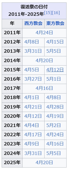復活祭は移動祝日であり、もともと太陰暦にしたがって決められた日であったため、年によって太陽暦での日付が変わる。グレゴリオ暦を用いる西方教会では、毎年3月22日から4月25日の間のいずれかの日曜日、東方教会では、グレゴリオ暦の4月4日から5月8日の間のいずれかの日曜日に祝われる。
