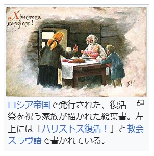 ロシア帝国で発行された、復活祭を祝う家族が描かれた絵葉書。左上には「ハリストス復活!」と教会スラヴ語で書かれている。