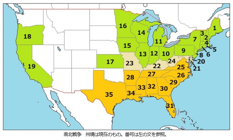 ^ 合衆国の首都であるワシントンD.C.はちょうどバージニア州(連合国)とメリーランド州(合衆国)の間にあるため、メリーランド州が南部連合国に寝返った場合は首都が北部州から完全に切り離される危険性があった。