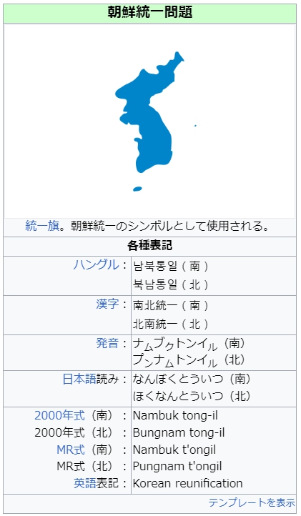 各種表記 ハングル: 남북통일(南) 북남통일(北) 漢字: 南北統一(南) 北南統一(北) 発音: ナムブクトンイル(南) プンナムトンイル(北) 日本語読み: なんぼくとういつ(南) ほくなんとういつ(北) 2000年式(南): 2000年式(北): MR式(南): MR式(北): 英語表記: Nambuk tong-il Bungnam tong-il Nambuk t’ongil Pungnam t’ongil Korean reunification テンプレートを表示