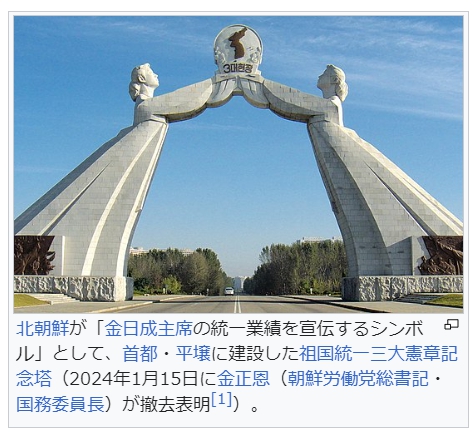 北朝鮮が「金日成主席の統一業績を宣伝するシンボル」として、首都・平壌に建設した祖国統一三大憲章記念塔(2024年1月15日に金正恩(朝鮮労働党総書記・国務委員長)が撤去表明[1])。