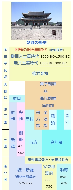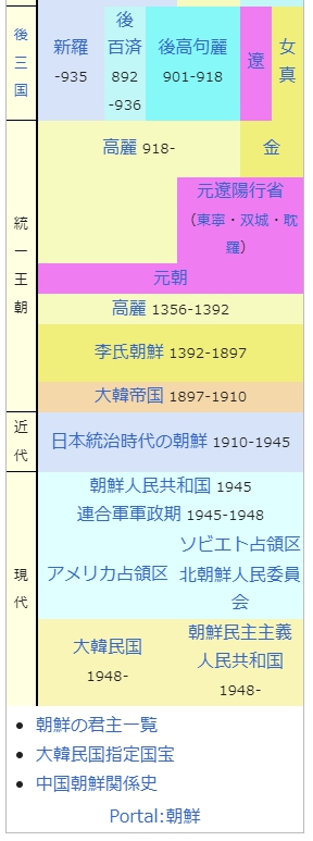 朝鮮歷史 朝鮮の歴史 考古学 朝鮮の旧石器時代(朝鮮語版) 櫛目文土器時代 8000 BC-1500 BC 無文土器時代 1500 BC-300 BC 伝説 檀君朝鮮 古朝鮮 箕子朝鮮 燕 辰国 衛氏朝鮮 原三国 辰韓 弁韓 漢四郡 馬韓 帯方郡 楽浪郡 濊 貊 沃 沮 三国 伽耶 42- 562 百済 高句麗 新羅 南北国 唐熊津都督府・安東都護府 統一新羅 鶏林州都督府 676-892 安東都護府 668-756 渤海 698-926 後三国 新羅 -935 後 百済 892 -936 後高句麗 901-918 遼 女真 統一 王朝 高麗 918- 金 元遼陽行省 (東寧・双城・耽羅) 元朝 高麗 1356-1392 李氏朝鮮 1392-1897 大韓帝国 1897-1910 近代 日本統治時代の朝鮮 1910-1945 現代 朝鮮人民共和国 1945 連合軍軍政期 1945-1948 アメリカ占領区 ソビエト占領区 北朝鮮人民委員会 大韓民国 1948- 朝鮮民主主義 人民共和国 1948- 朝鮮の君主一覧 大韓民国指定国宝 中国朝鮮関係史 Portal:朝鮮