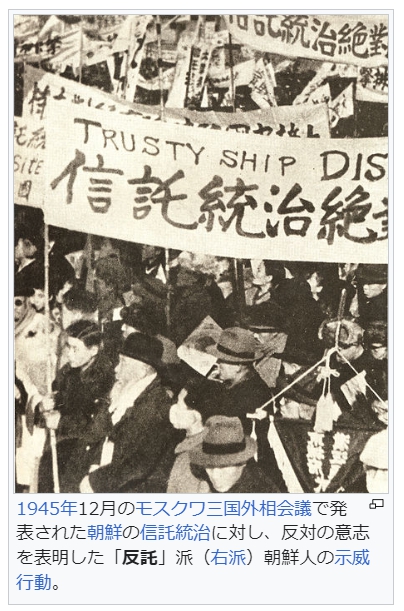 だが、この協定が朝鮮半島に不正確な形で伝わると(該当記事参照)、分断下の南北両朝鮮で信託統治に賛成(賛託)した金日成、呂運亨等の左派と信託統治に反対(朝鮮語版)(反託)した李承晩、金九等の右派がそれぞれ南北で抗争を繰り広げ[8]。その後の分断の一要因となった。