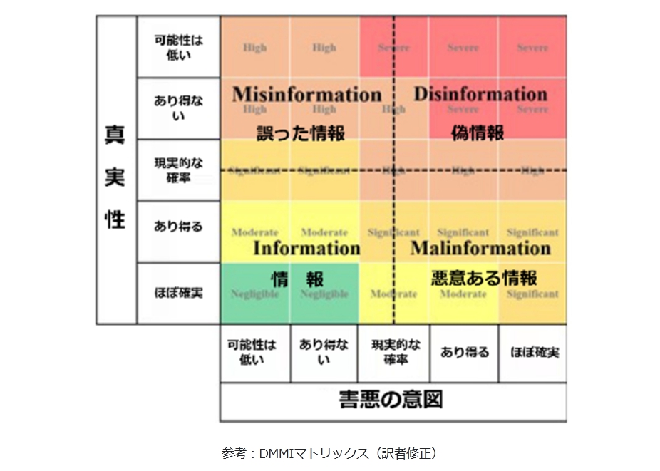 偽情報は、悪意のある偽の情報である。ただし、情報戦などにおいて流される情報は、必ずしも虚偽の情報である必要はなく、真偽を織り交ぜた情報が効果的とされる。DMMIマトリックスは有用で、情報を正しさと悪意によって分類することができる(Newman、2022) 参考:DMMIマトリックス(訳者修正)