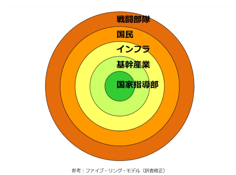 以上のように、この記事では、政治指導者、軍事意思決定者、国民からなる認知ドメイン、情報通信インフラからなる情報ドメイン、物理的軍事力からなる3リングモデルを提唱する。