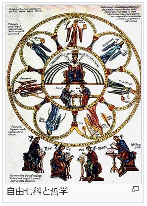 5世紀から6世紀(古代ローマ末期・中世初期)になると、マルティアヌス・カペッラ、カッシオドルス、ボエティウスら複数の人物が、後の「自由七科」(セプテム・アルテス・リベラレス、septem artes liberales、七自由学芸)に含まれる七科を決定付けた[53]。 カペッラは『フィロロギアとメルクリウスの結婚』で、文法学・修辞学・論理学・算術・幾何学・天文学・音楽の七学科を擬人化した。