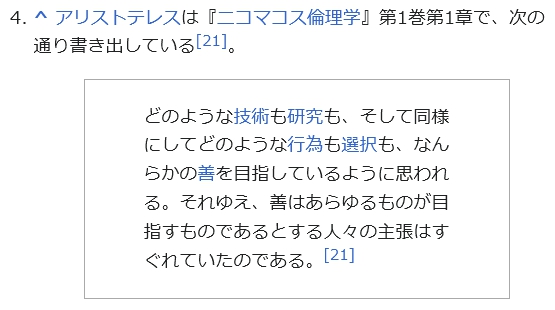 ^ アリストテレスは『ニコマコス倫理学』第1巻第1章で、次の通り書き出している[21]。