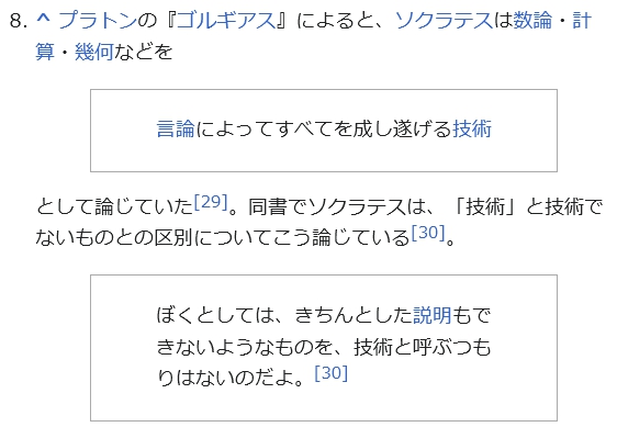 として論じていた[29]。同書でソクラテスは、「技術」と技術でないものとの区別についてこう論じている[30]。
