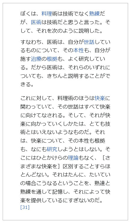 ぼくは、料理術は技術でなく熟練だが、医術は技術だと思うと言った。そして、それを次のように説明した。