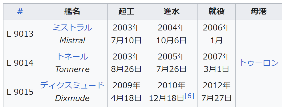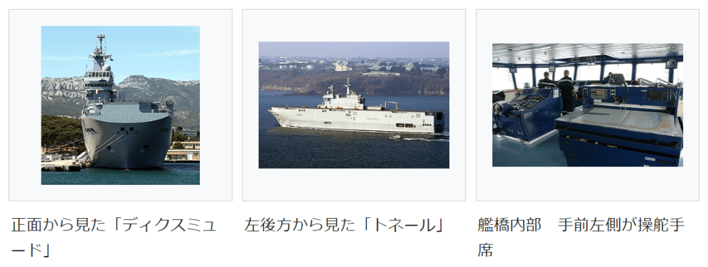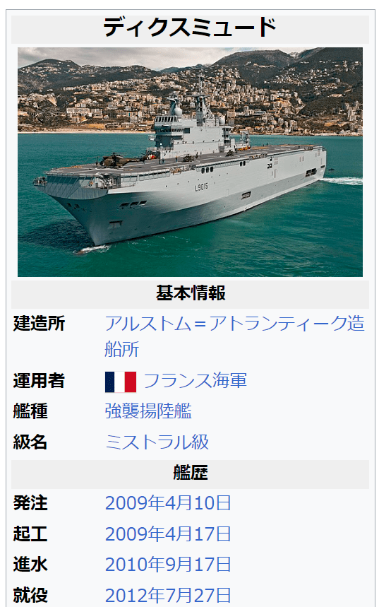 脚注 ^ 在日フランス大使館 (2015年5月26日). “フランス海軍「ディクスミュード」が佐世保に親善寄港”. 2015年6月23日閲覧。 ^ European Counter Piracy Naval Forces Strengthened by Two French Warships ^ Le Dixmude achemine une importante force blindee au Mali ^ Le Dixmude debarque a Dakar 500 soldats et 140 vehicules 外部リンク (フランス語) フランス軍公式ページ (フランス語) Batiment de Projection et de Commandement Mistral 関連項目 フランス海軍 フランス海軍艦艇一覧 フランス海軍現役艦艇一覧 表話編歴 ミストラル級強襲揚陸艦 フランス海軍 ミストラル トネール ディクスミュード エジプト海軍 ※元ロシア海軍向け ガマール・アブドゥル=ナーセル(旧「ウラジオストク」) アンワル・アッ=サーダート(英語版)(旧「セバストポリ」) 前級 フードル級 次級 – フランス海軍艦艇一覧 エジプト海軍艦艇一覧 スタブアイコン この項目は、軍艦に関連した書きかけの項目です。この項目を加筆・訂正などしてくださる協力者を求めています(P:軍事・PJ軍事・PJ船)。
