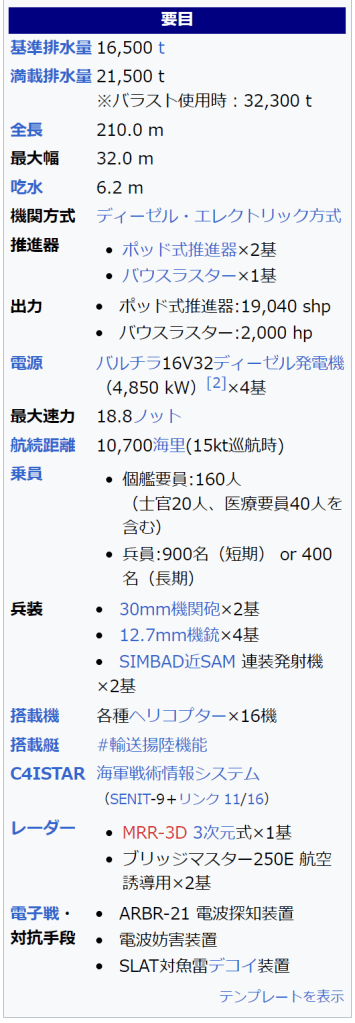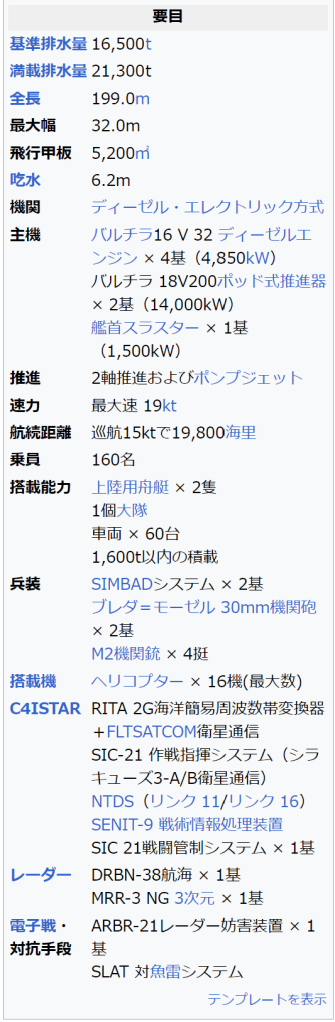 基準排水量 16,500 t 満載排水量 21,500 t ※バラスト使用時:32,300 t 全長 210.0 m 最大幅 32.0 m 吃水 6.2 m 機関方式 ディーゼル・エレクトリック方式 推進器 ポッド式推進器×2基 バウスラスター×1基 出力 ポッド式推進器:19,040 shp バウスラスター:2,000 hp 電源 バルチラ16V32ディーゼル発電機(4,850 kW)[2]×4基 最大速力 18.8ノット 航続距離 10,700海里(15kt巡航時) 乗員 個艦要員:160人 (士官20人、医療要員40人を含む) 兵員:900名(短期) or 400名(長期)