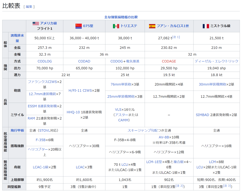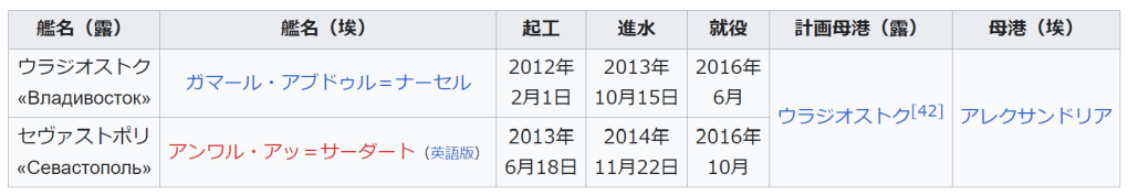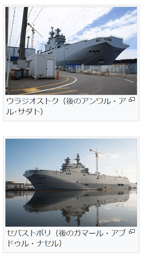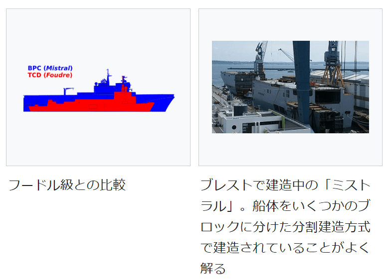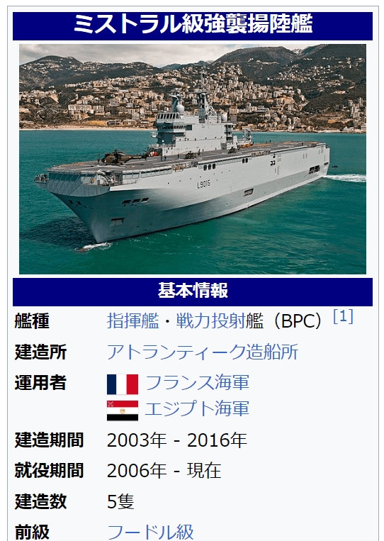 脚注 [脚注の使い方] 注釈 ^ 揚陸艦任務 ^ オーストラリア海軍のキャンベラ級強襲揚陸艦とトルコ海軍の「アナドル」 ^ エジプト海軍の「ガマール・アブドゥル=ナーセル」と「アンワル・アッ=サーダート(英語版)」 出典 ^ a b c d e f g h i 多田 2008. ^ Wertheim 2013, p. 212. ^ “Mistral Class ? Amphibious Assault Ships” (英語). Naval Technology (2017年2月2日). 2022年9月28日閲覧。 ^ 「海外艦艇ニュース 仏強襲揚陸艦に回転翼UAV S-100を搭載」 『世界の艦船』通巻943集(2021年3月号) 海人社 P.166 ^ 「こちらも公試へ!仏新造強襲揚陸艦「ディズミュード」 サン・ナゼールを出港」『世界の艦船』第743号、海人社、2011年7月、56-57頁。 ^ “Saint-Nazaire : Le BPC Dixmude transfere au bassin C”. Mer et Marine (2010年12月20日). 2010年12月26日時点のオリジナルよりアーカイブ。2022年9月28日閲覧。 ^ “French warship Russia wants stirs debate” (英語). UPI (2009年11月23日). 2022年9月28日閲覧。 ^ “Корму второго “Мистраля” спустят на воду в апреле 2014 года”. flot.com (2014年4月27日). 2014年4月27日時点のオリジナルよりアーカイブ。2022年9月28日閲覧。 ^ a b “Франция передала России часть технологий строительства “Мистралей”” (ロシア語). РИА Новости (20150618T0907). 2022年9月28日閲覧。 ^ “Опубликованы новые детали проекта универсального десантного корабля типа “Мистраль” для российского ВМФ”. АРМС-ТАСС (2012年7月23日). 2012年12月17日時点のオリジナルよりアーカイブ。2022年9月28日閲覧。 ^ “Российские ДВКД типа “Мистраль” в отличие от французских аналогов будут оснащены ударным и оборонительным оружием”. АРМС-ТАСС. 2012年4月15日時点のオリジナルよりアーカイブ。2022年9月28日閲覧。 ^ “Источник: Российские офицеры учатся во Франции пользоваться “Мистралем””. flot.com (2015年9月27日). 2015年9月27日時点のオリジナルよりアーカイブ。2022年9月28日閲覧。 ^ Криворучек, Алексей (2014年5月6日). “Первый российский ≪Мистраль≫ лишился Syracuse” (ロシア語). Известия. 2022年9月28日閲覧。 ^ “Вертолетоносец ≪Севастополь≫ оснастят российской системой управления” (ロシア語). Lenta.RU (2014年4月30日). 2022年9月28日閲覧。 ^ “”Мистрали” получат российскую оптико-электронную систему”. flot.com. 2014年7月16日時点のオリジナルよりアーカイブ。2022年9月28日閲覧。 ^ 小泉悠『ロシア海軍は生まれ変われるか』ユーラシア・ブックレット166、2011年、東洋書店。ISBN 978-48645-90099 ^ 「海外艦艇ニュース ロシアが2個海軍歩兵連隊を旅団に格上げ」『世界の艦船』第792集(2014年2月号) 海人社 ^ “Рогозин: Россия может обойтись без “Мистраля””. ТАСС. 2022年9月28日閲覧。 ^ “Контракт по “Мистралям” изначально был ошибкой, заявил Рогозин” (ロシア語). РИА Новости (2014年12月4日). 2022年9月28日閲覧。 ^ “小野寺防衛相:「ミストラル」のロシア輸出は極東のパワー・バランスを崩す”. ロシアの声 (2013年9月28日). 2013年9月28日時点のオリジナルよりアーカイブ。2022年9月28日閲覧。 ^ 「U.S. opposes French sale of Mistral warships to Russia: senior official」『Reuters』2014年7月21日。2022年9月28日閲覧。 ^ “France says cannot deliver first helicopter carrier to Russia” (英語). Reuters. (2014年9月3日) 2022年9月28日閲覧。 ^ “Россия официально попросила Францию объяснить непоставку “Мистраля”” (ロシア語). РИА Новости (2015年1月13日). 2022年9月28日閲覧。 ^ “Mistral delivery to Russia to be approved by mid-November”. TASS. (2014年10月25日). オリジナルの2014年10月26日時点におけるアーカイブ。 26 October 2014閲覧。 ^ a b 「海外艦艇ニュース ロシア向けミストラル級強襲揚陸艦の最新動向」 『世界の艦船』第808集(2014年12月号) 海人社 P.164 ^ “France postpones warship delivery to Russia ‘until further notice’” (英語). DW (2014年11月25日). 2022年9月28日閲覧。 ^ “Russia Mistral: France halts delivery indefinitely”. BBC News (2014年11月25日). 25 November 2014閲覧。 ^ “СМИ: Франция не в том положении, чтобы отменять договор по “Мистралям”” (ロシア語). РИА Новости (2014年11月17日). 2022年9月28日閲覧。 ^ “Россия не будет требовать от Франции неустоек за отказ поставить “Мистрали””. ТАСС (2015年4月16日). 2022年9月28日閲覧。 ^ “Кожин: РФ и Франция подпишут договор о возврате денег за “Мистрали”” (ロシア語). РИА Новости (2015年7月2日). 2022年9月28日閲覧。 ^ “Источник: РФ обсуждает с Францией возврат систем связи с “Мистралей”” (ロシア語). РИА Новости (2015年7月23日). 2022年9月28日閲覧。 ^ “Источник