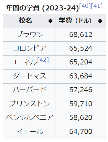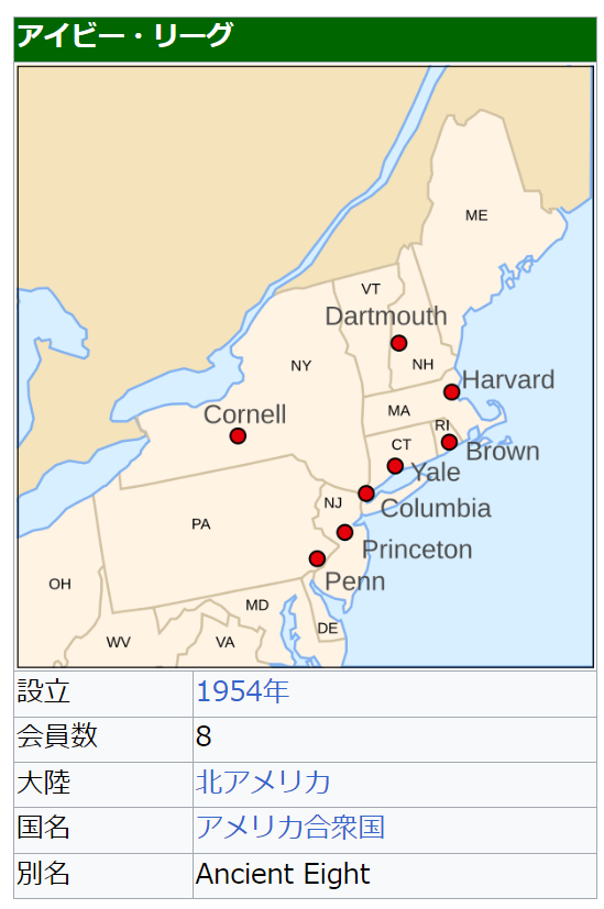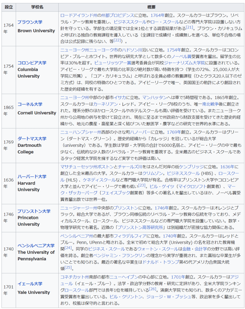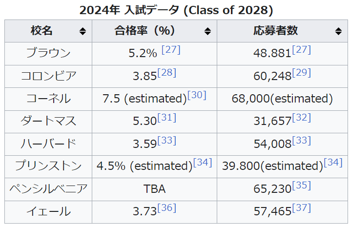 脚注 [脚注の使い方] 注釈 ^ 但し、本文記事中で詳細を説明している通り、スポーツ競技連盟として、その母体は戦前からあったものの正式にアイビーリーグが成立したのは戦後(1945年)のことである。ちなみに東京六大学野球連盟の成立とともに東京六大学の概念が誕生したのは1926年になる。 出典 ^ a b c d e “Ivy League.” Encyclopedia of African American Society, edited by Gerald D. Jaynes, Sage Publications, 1st edition, 2005.; Hansen, Jan B., and Hansen. “Ivy League Colleges.” Encyclopedia of Giftedness, Creativity, and Talent, edited by Barbara Kerr, Sage Publications, 1st edition, 2009. ^ a b c d e f g h アキ・ロバーツ、竹内洋『アメリカの大学の裏側』朝日新書, 2017. ^ a b U.S. Department of Education, “Rethinking Higher Education,” Dec. 2018 ; “The current state of U.S. higher education, top to bottom” (academics.com) ^ a b c d e f g h i “Do Ivy League or Elite Educated CEOs Outperform Others?” In Ideas for Leaders Collection, edited by Roddy Millar. IEDP Ideas for Leaders Ltd, 2016. ; “Ivy League.” In Brewer’s Dictionary of Modern Phrase and Fable, edited by Adrian Room, and Ebenezer Cobham Brewer. 2nd ed. Cassell, 2009. ^ List of Presidents of the United States by educationも参照 ^ “Ivy League.” Britannica Concise Encyclopedia, Encyclopaedia Britannica, Britannica Digital Learning, 2017. ^ a b Hoeveler, J. David. “Colleges and Universities.” The Bloomsbury Encyclopedia of the American Enlightenment, edited by Mark Spencer, Bloomsbury, 1st edition, 2014.; “Association of American Universities (AAU).” Greenwood Dictionary of Education, edited by John W. Collins, and Nancy Patricia O’Brien, Greenwood, 2nd edition, 2011. ^ Abbas, Andrea, and Abbas. “Higher Education.” Encyclopedia of Consumer Culture, Dale Southerton, Sage Publications, 1st edition, 2011. ; Chambers, Laura. “Higher Education.” Encyclopedia of Race, Ethnicity, and Society, Richard T. Schaefer, Sage Publications, 1st edition, 2008. ^ https://www.theguardian.com/world/2002/jul/27/highereducation.internationaleducationnews ^ Picchi, Aimee (2023年3月29日). “Ivy League tuition and costs are close to $90,000 per year: “Prices just keep going up” – CBS News” (英語). http://www.cbsnews.com. 2024年5月16日閲覧。 ^ “Ivy League College Costs Soar to More Than $90,000 a Year”. Bloomberg. 2024年5月16日閲覧。 ^ “IVY LEAGUE”. Athletesin Action in the Ivy League date=October 17, 2017. 2017年12月30日閲覧。 ^ “Ivy League.” In Brewer’s Dictionary of Modern Phrase and Fable, edited by Adrian Room, and Ebenezer Cobham Brewer. 2nd ed. Cassell, 2009. ^ “What are the Ivy Plus colleges?” (英語). The Ivy Institute. 2024年5月22日閲覧。 ^ Shemmassian, Dr (2023年11月8日). “What is a Public Ivy?” (英語). Shemmassian Academic Consulting. 2024年5月22日閲覧。 ^ “Little Ivies: The 12 Best Liberal Arts Schools New England” (英語). https://www.collegeconfidential.com. 2024年5月22日閲覧。 ^ “What Are Hidden Ivies? – Crimson Education JA”. http://www.crimsoneducation.org. 2024年5月22日閲覧。 ^ a b c Hansen, Jan B.. “Ivy League Colleges”. Encyclopedia of Giftedness, Creativity, and Talent (2455 Teller Road, Thousand Oaks California 91320 United States: SAGE Publications, Inc.). ISBN 9781412949712. ^ 1942-, Goldstein, Richard, (1996). Ivy League autumns : an illustrated history of college football’s grand old rivalries. St. Martin’s Press. ISBN 0312146299. OCLC 34651607 ^ a b “Archived: Women’s Colleges in the United States: History, Issues, and Challenges”. Ed.gov. 2011年7月21日時点のオリジナルよりアーカイブ。2011年1月30日閲覧。 ^ “Brown University”. 2016年4月17日閲覧。 ^ https://www.brown.edu/academics/college/degree/curriculum ^ Peter Jacobs (31 3月 2015). “Ivy League acceptance Class of 2019 – Business Insider”. Business Insider. 2016年4月17日閲覧。 ^ “アーカイブされたコピー”. 2006年7月11日時点のオリジナルよりアーカイブ。2016年12月12日閲覧。 ^ http://www.businessinsider.com/trump-is-the-first-upenn-wharton-graduate-to-become-president-2016-11 ^ “Best Law School Rankings – Law Program Rankings – US News”. 2016年4月17日閲覧。 ^ a b “Brown admits 5.2% of applicants to class of 2028, third-lowest acceptance rate in history” (英語). The Brown Daily Herald. 2024年5月20日閲覧。 ^ “Columbia Admits 3.85% Of Applicants To The Class of 2028 – Crimson Education JP” (英語). http://www.crimsoneducation.org. 2024年5月20日閲覧。 ^ “Columbia Announces Class of 2028 Admissions Decisions | Columbia Undergraduate Admissions”. undergrad.admissions.columbia.edu. 2024年5月20日閲覧。 ^ “Cornell University Acceptance Rate for Class of 2028 – Crimson Education JP” (英語). http://www.crimsoneducation.org. 2024年5月20日閲覧。 ^ “Class of 2028 Draws Record Number of Applicants | Dartmouth” (英語). home.dartmouth.edu (2024年3月29日). 2024年5月20日閲覧。 ^ “Class of 2028 Draws Record Number of Applicants | Dartmouth” (英語). home.dartmouth.edu (2024年3月29日). 2024年5月21日閲覧。 ^ a b “Harvard Accepts 3.59% of Applicants to Class of 2028 | News | The Harvard Crimson”. http://www.thecrimson.com. 2024年5月20日閲覧。 ^ a b “Princeton Withholds Admissions Stats For Class Of 2028 – Crimson Education JP” (英語). http://www.crimsoneducation.org. 2024年5月20日閲覧。 ^ Stone, Dr Elizabeth Doe (2024年4月5日). “Penn’s Record-Breaking Admissions Cycle” (英語). Top Tier Admissions. 2024年5月22日閲覧。 ^ Rim, Christopher. “Why Top Students Are Getting Rejected From The Ivy League” (英語). Forbes. 2024年5月20日閲覧。 ^ “Yale College admits 2,146 applicants from record applicant pool