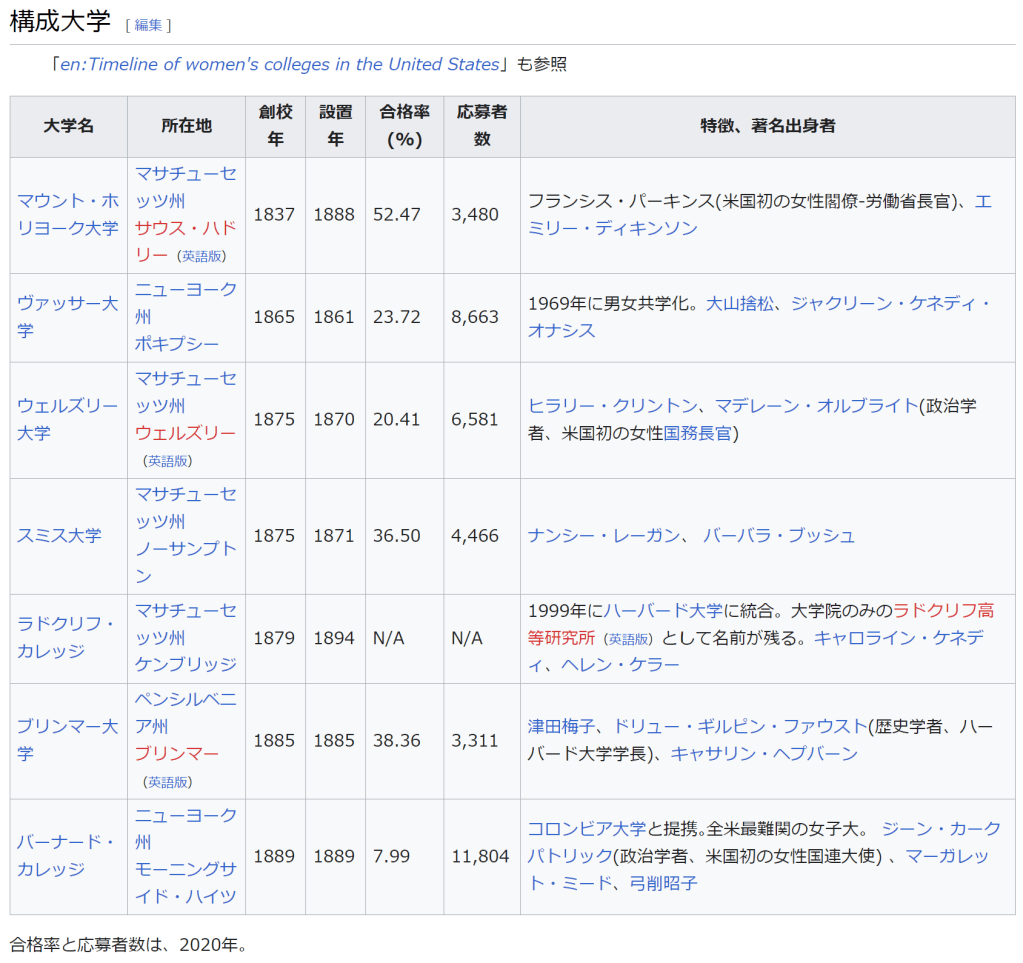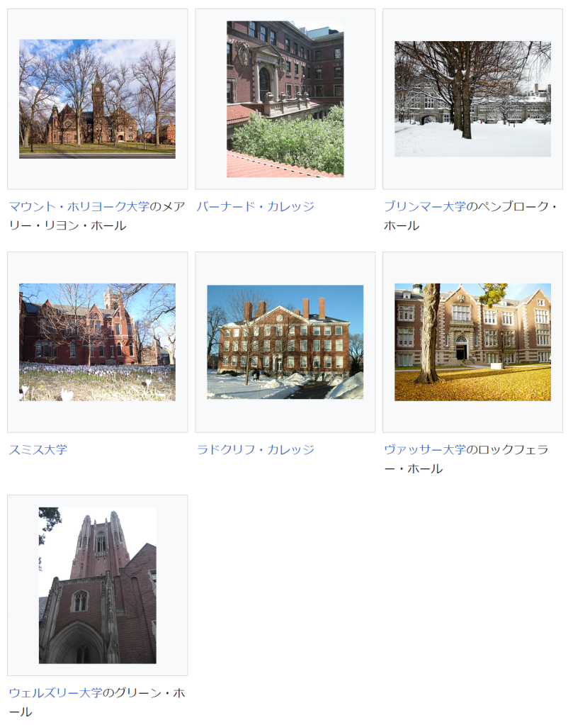 脚注 ^ a b Irene Harwarth. “Women’s Colleges in the United States: History, Issues, and Challenges”. U.S. Department of Education National Institute on Post-secondary Education, Libraries, and Lifelong Learning. February 4, 2005時点のオリジナルよりアーカイブ。2020年10月15日閲覧。 ^ “About Mount Holyoke”. mountholyoke.edu 2006年9月1日閲覧。 ^ “Radcliffe Mission, Vision, and History”. harvard.edu. 2018年5月6日閲覧。 ^ “Hard Earned Gains for Women at Harvard”. The Harvard Gazette 2018年5月6日閲覧。 ^ “About Us” (英語). Radcliffe Institute for Advanced Study at Harvard University (2011年6月9日). 2020年3月10日閲覧。 ^ Robert A. McCaughey (Spring 2003). “Women and the Academy”. Higher Learning in America, History BC4345x. Barnard College. 2006年5月12日時点のオリジナルよりアーカイブ。2020年10月15日閲覧。 ^ “Pleiades | Greek mythology” (英語). Encyclopedia Britannica. 2020年3月10日閲覧。 ^ “Chronology”. Barnard College. June 15, 2011時点のオリジナルよりアーカイブ。August 19, 2012閲覧。 ^ “Partnership with Columbia”. Barnard College. August 19, 2012閲覧。 ^ “A Brief History of Bryn Mawr College”. Bryn Mawr. August 19, 2012閲覧。 ^ “A Detailed History”. Mount Holyoke College. August 19, 2012閲覧。 ^ “Smith College Presidents”. Smith College. October 7, 2012時点のオリジナルよりアーカイブ。August 19, 2012閲覧。 ^ “Wellesley says it won’t go coed; Plans Drive for $70-Million Over Next 10 Years”. The New York Times: p. 43. (March 9, 1973) August 19, 2012閲覧。 ^ “US News Rankings”. 2020年10月15日閲覧。 ^ “Wall Street Journal Rankings”. 2020年10月15日閲覧。 ^ Brune, Adrian (April 8, 2007). “When She Graduates as He”. The Boston Globe Magazine 2020年10月15日閲覧。 ^ Kellaway, Mitch (September 3, 2014). “WATCH: First of ‘Seven Sisters’ Schools to Admit Trans Women”. Advocate.com. 2020年10月15日閲覧。 ^ “Barnard Announces Transgender Admissions Policy”. Barnard College website. (June 4, 2015) 2020年10月15日閲覧。 ^ Gibson, Arlene (February 9, 2015). “A Letter from Bryn Mawr Board Chair Arlene Gibson”. Bryn Mawr College website 2020年10月15日閲覧。 ^ “Admission Policy Announcement”. Smith College website. (May 2, 2015) 2020年10月15日閲覧。 参考文献 Creighton, Joanne V. “A Tradition of Their Own: Or, If a Woman Can Now Be President of Harvard, Why Do We Still Need Women’s Colleges?”. Howard Greene; Mathew W. Greene (2000). Greenes’ Guides to Educational Planning: The Hidden Ivies: Thirty Colleges of Excellence. New York: HarperCollins. ISBN 0-06-095362-4 Dolkart, Andrew S. (1998). Morningside Heights: A History of its Architecture and Development. Columbia University Press. ISBN 978-0-231-07850-4. OCLC 37843816 Horowitz, Helen Lefkowitz. Alma Mater: Design and Experience in the Women’s Colleges from Their Nineteenth-Century Beginnings to the 1930s (2nd edition). Amherst: University of Massachusetts Press, 1993. Perkins, Linda M. (Spring 1998). “The Racial Integration of the Seven Sister Colleges”. Journal of Blacks in Higher Education (19): 104?08. doi:10.2307/2998936. JSTOR 2998936. 関連項目 女子大学連合(英語版) ゴールデントライアングル (大学)(英語版) – イギリスの名門大学3校の総称 外部リンク “About the Seven Sisters”?Mount Holyoke College “College Women: Documenting the History of Women in Higher Education”?digital archives portal created by the libraries of the colleges formerly known as the “Seven Sisters” in 2015. Seven Sisters Alumnae Association カテゴリ: アメリカ合衆国の女子大学セブン・シスターズ (大学)名数7 最終更新 2024年8月15日 (木) 04:33 (日時は個人設定で未設定ならばUTC)。 テキストはクリエイティブ・コモンズ 表示-継承ライセンスのもとで利用できます。追加の条件が適用される場合があります。詳細については利用規約を参照してください。』