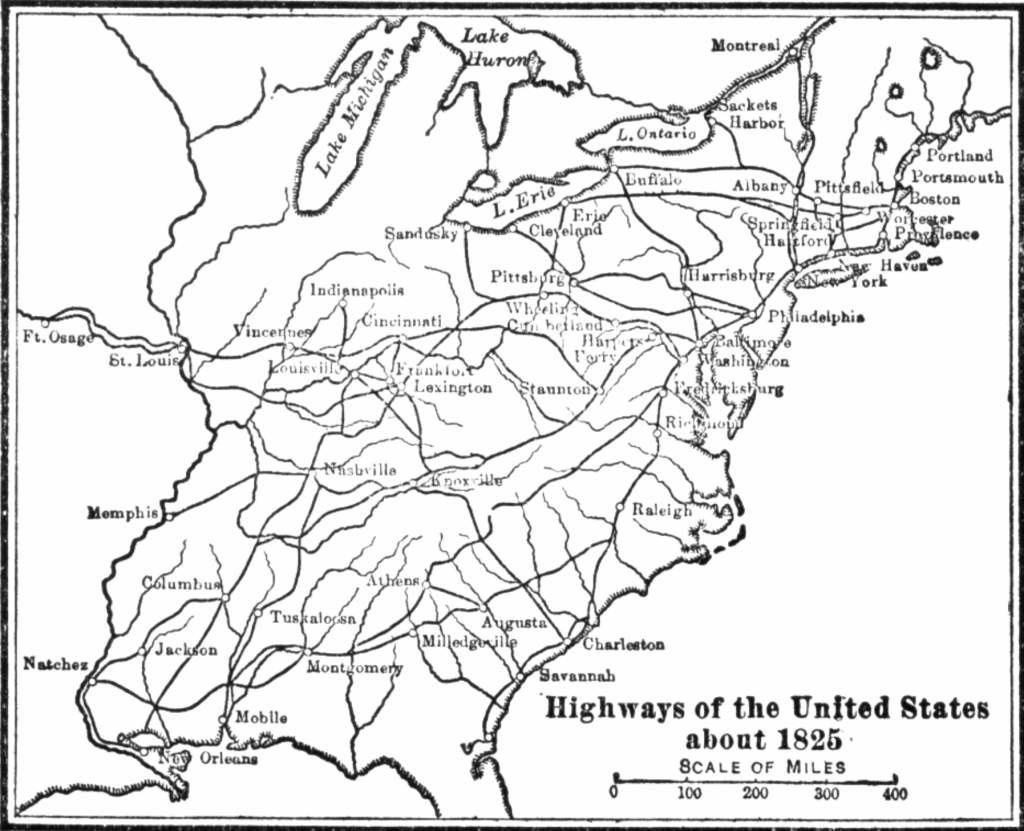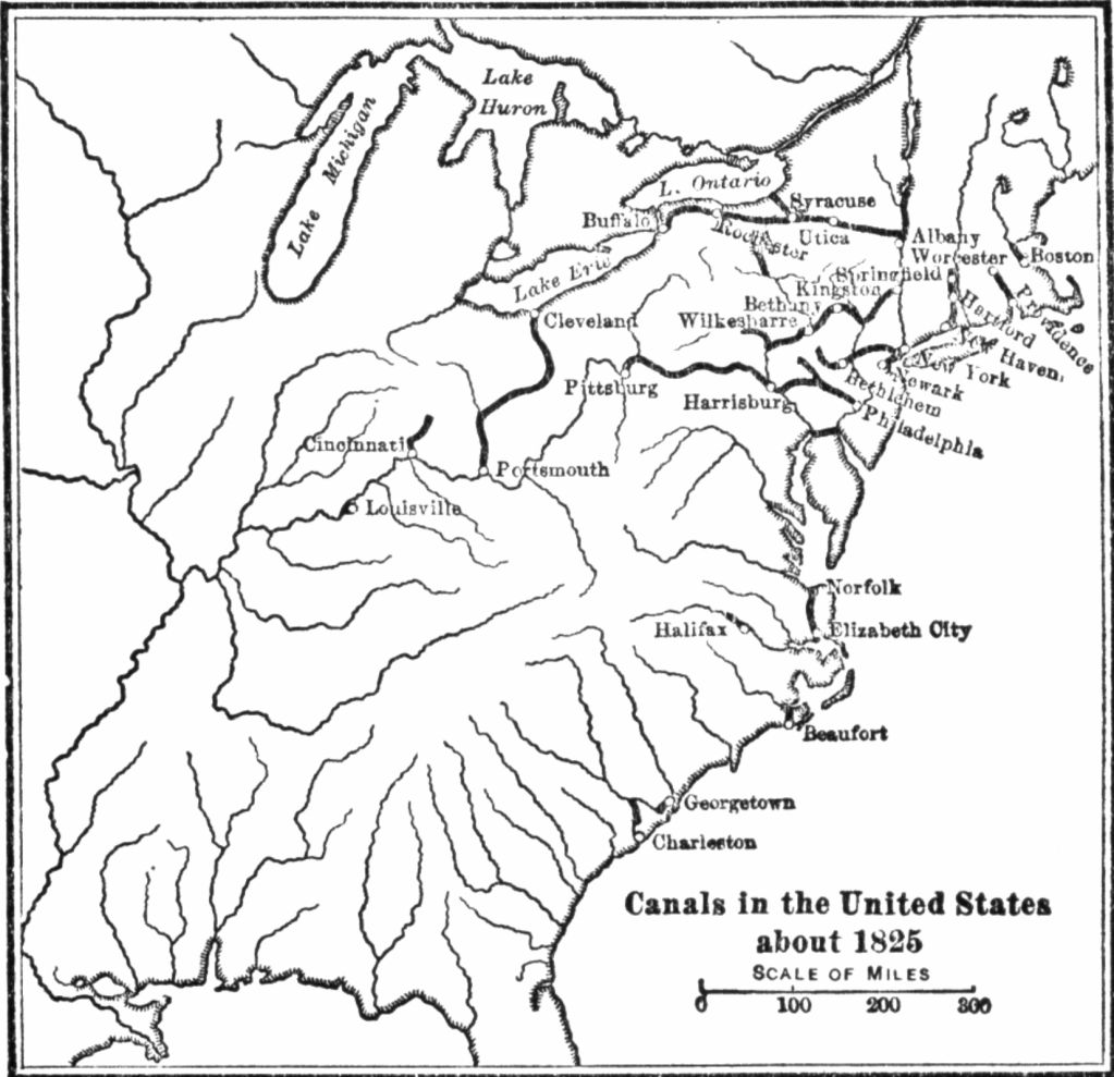 有料道路と同様に、初期の運河も私設の共同出資会社によって建設され所有され運営されたが、後に大きな計画は州の予算で行われるようになった。ニューヨーク州知事デウィット・クリントンが提案したエリー運河は、地方債の発行によって公共のリスクで予算化され、公共の利益として計画された最初の運河であった[15]。この計画が1825年に完成されたとき、エリー湖とハドソン川が繋がれ、閘門の数は83カ所、前兆は363マイル (584 km) となった。エリー運河の成功は国中の運河建設ブームを呼び、1816年から1840年の間に総延長で3,326マイル (5,322 km) の人工水路が出来上がった[16]。ニューヨーク州のシラキュースとバッファロー、オハイオ州のクリーブランドなど大きな運河沿いにあった小さな町が、大きな産業と交易の中心に成長し、一方でペンシルベニア州、オハイオ州およびインディアナ州などの州は熱狂的な運河建設のために破産寸前までいった[16]。