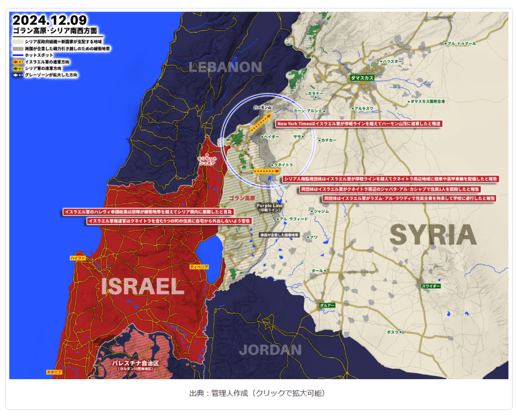 New York Timesは「イスラエル軍が停戦ラインを越えてハーモン山頂に進軍した」と報じており、シリア人権監視団体=المرصد السوري لحقوق الإنسانはイスラエル軍が「クネイトラ周辺地域に戦車や装甲車輌を配備した」「イスラエル軍がクネイトラ周辺のジャバタ・アル・カシャブで住民1人を銃殺した」「イスラエル軍がラズム・アル・ラワディで住民全員を拘束して学校に連行した」と報告しており、イスラエル軍によるシリア領内への展開が一時的なものになるか、恒久的なものになるかは誰にも分からない。
