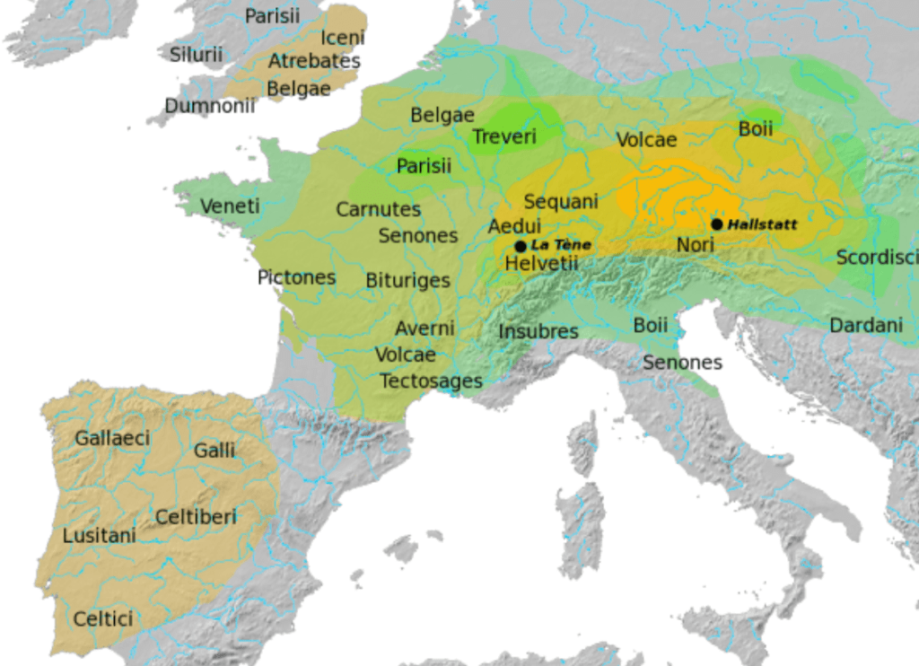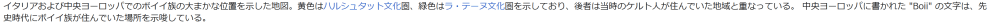 イタリアおよび中央ヨーロッパでのボイイ族の大まかな位置を示した地図。黄色はハルシュタット文化圏、緑色はラ・テーヌ文化圏を示しており、後者は当時のケルト人が住んでいた地域と重なっている。 中央ヨーロッパに書かれた “Boii” の文字は、先史時代にボイイ族が住んでいた場所を示唆している。