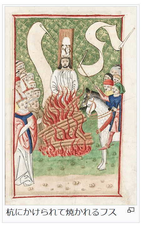 これが、ローマ教皇の逆鱗にふれ、フスとプラハ市は破門され、1414年のコンスタンツ公会議でフスは異端として火刑となった。