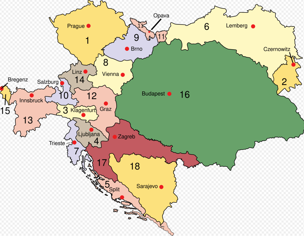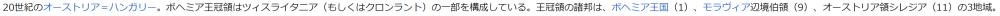 20世紀のオーストリア=ハンガリー。ボヘミア王冠領はツィスライタニア(もしくはクロンラント)の一部を構成している。王冠領の諸邦は、ボヘミア王国(1)、モラヴィア辺境伯領(9)、オーストリア領シレジア(11)の3地域。