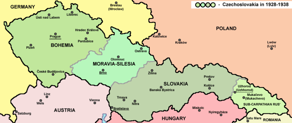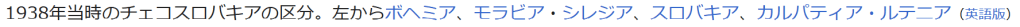 1938年当時のチェコスロバキアの区分。左からボヘミア、モラビア・シレジア、スロバキア、カルパティア・ルテニア(英語版)