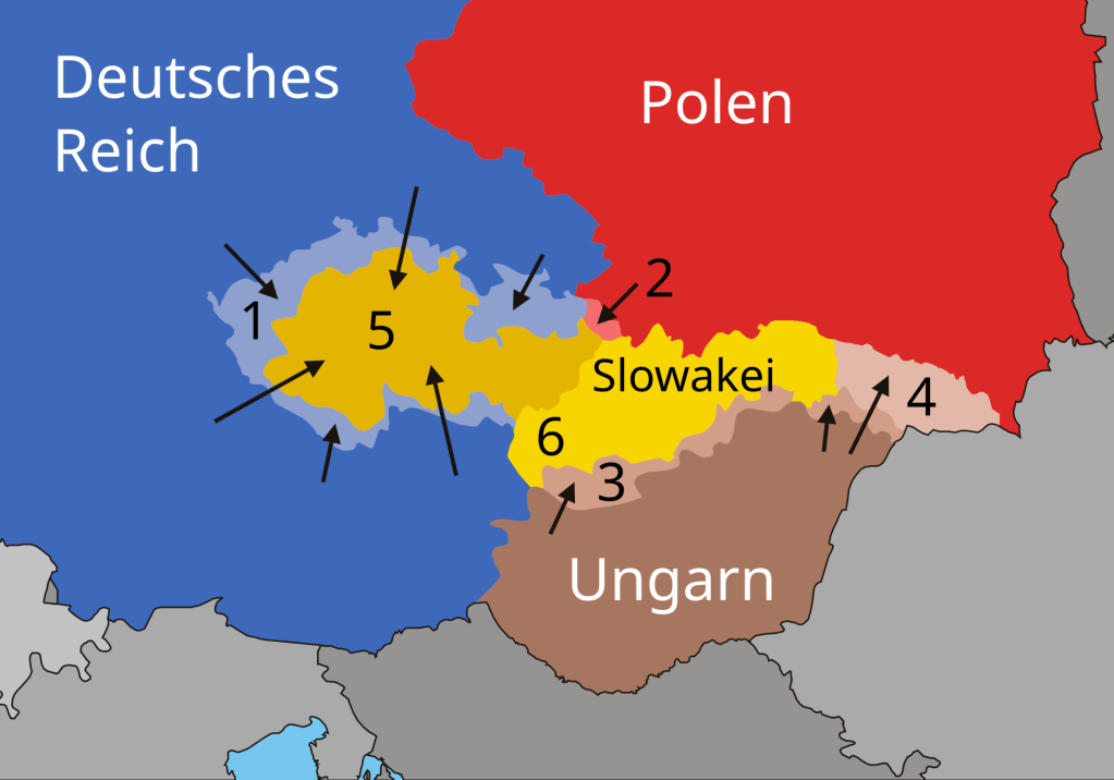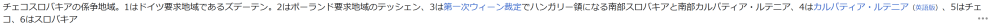 チェコスロバキアの係争地域。1はドイツ要求地域であるズデーテン。2はポーランド要求地域のテッシェン、3は第一次ウィーン裁定でハンガリー領になる南部スロバキアと南部カルパティア・ルテニア、4はカルパティア・ルテニア(英語版)、5はチェコ、6はスロバキア