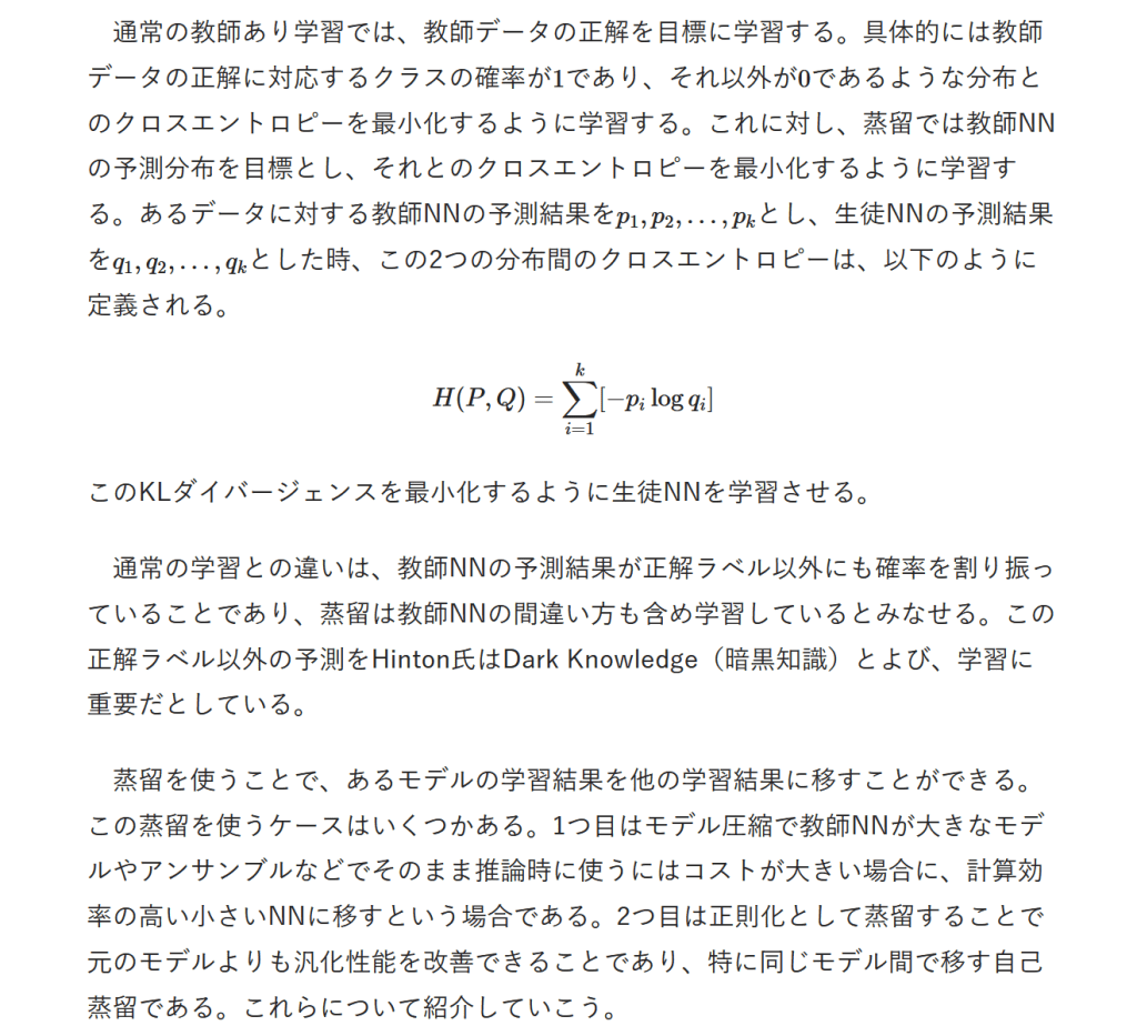 であり、それ以外が0であるような分布とのクロスエントロピーを最小化するように学習する。これに対し、蒸留では教師NNの予測分布を目標とし、それとのクロスエントロピーを最小化するように学習する。あるデータに対する教師NNの予測結果をp1,p2,…,pkとし、生徒NNの予測結果をq1,q2,…,qk
