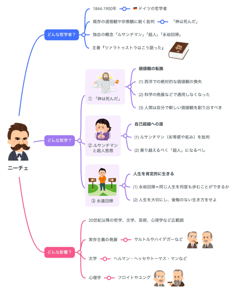 哲学者・思想家・古典文献学者として活躍し、代表的な著書には『ツァラトゥストラはかく語りき』『道徳の系譜』『善悪の彼岸』『権力への意志』などがあります。