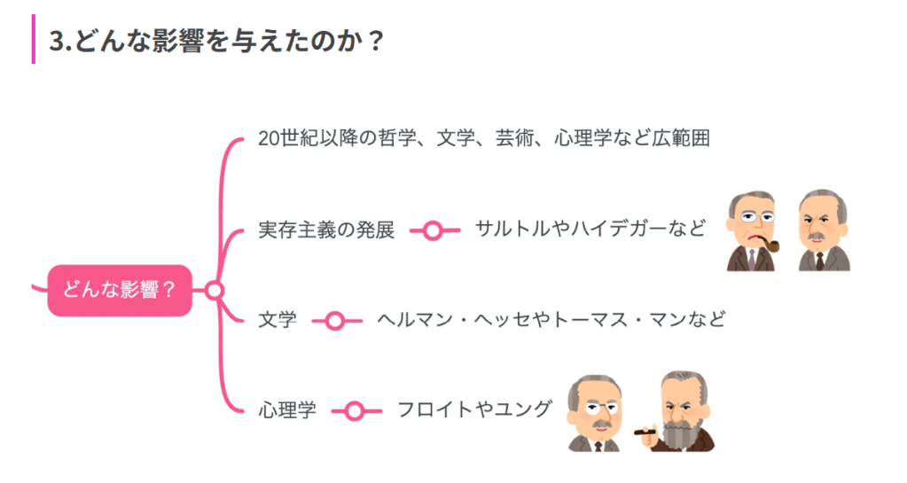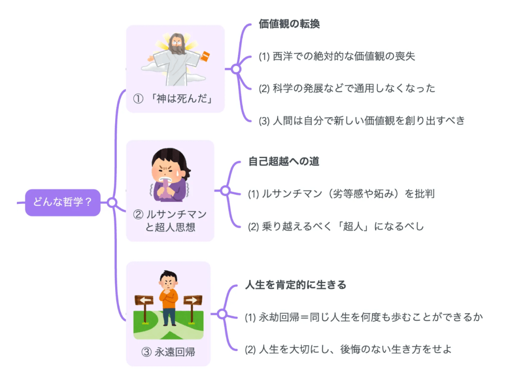 ニーチェは、現実の人間の存在に目を向けようとする「実存主義」の先駆者として有名です。また、あらゆる物事の根底に虚無を見いだし、既存の価値体系や権威を否定する思想である「ニヒリズム(虚無主義)」でもありました。彼は当時のヨーロッパで支持されていたキリスト教的思想を弱者の奴隷道徳とみなし、厳しく批判しました。