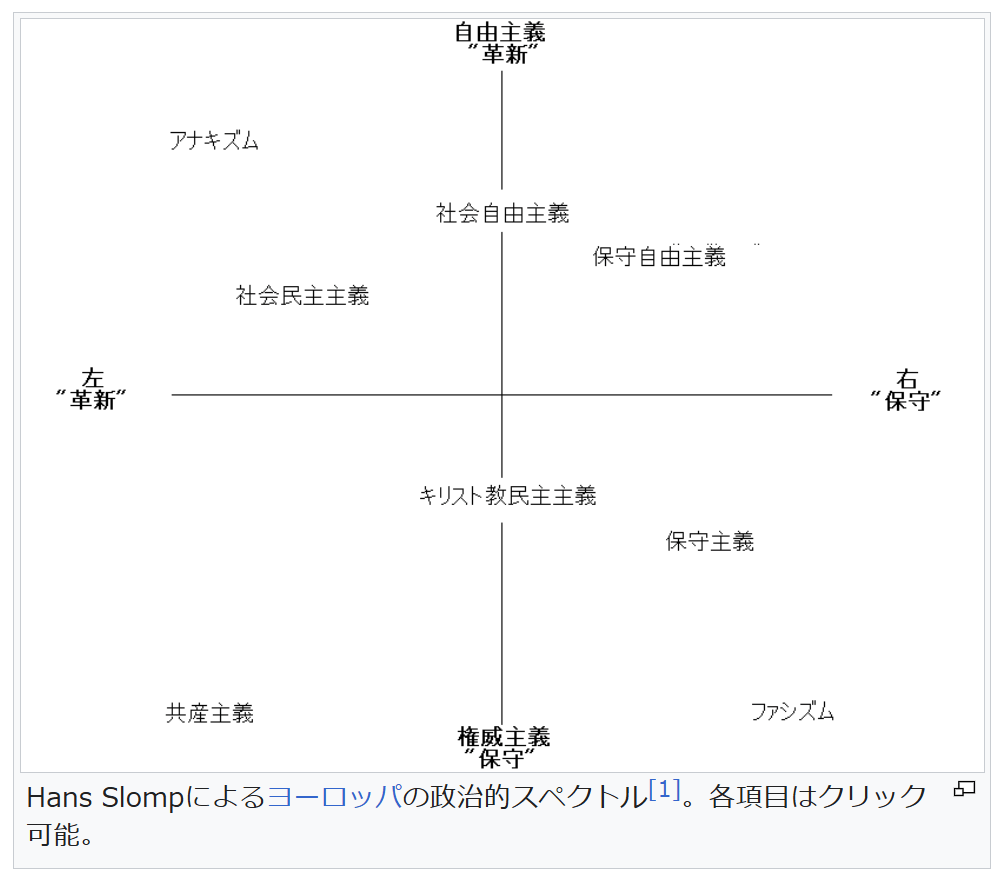 Hans Slompによるヨーロッパの政治的スペクトル[1]。各項目はクリック可能。